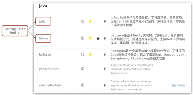 - Spring Data Redis: 整合了上图的 Jedis 和 lettuce 客户端。